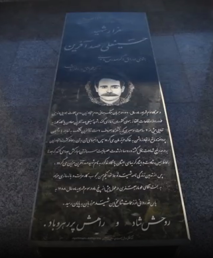 همسر حسینعلی و دو پسرش که در هنگام جنگ در روستا مانده بودند به همراه اهالی روستا بر پیکر او نماز خواندند و او را در همان پاسگاه به خاک سپردند.[۱۸] در سالهای اخیر، پاسگاه کَلوَز بهپاس این شهید شجاع ایرانی به پاسگاه صدآفرین تغییر نام داده شد و آرامگاه حسینعلی صدآفرین نیز بازسازی شد.[۱۹]